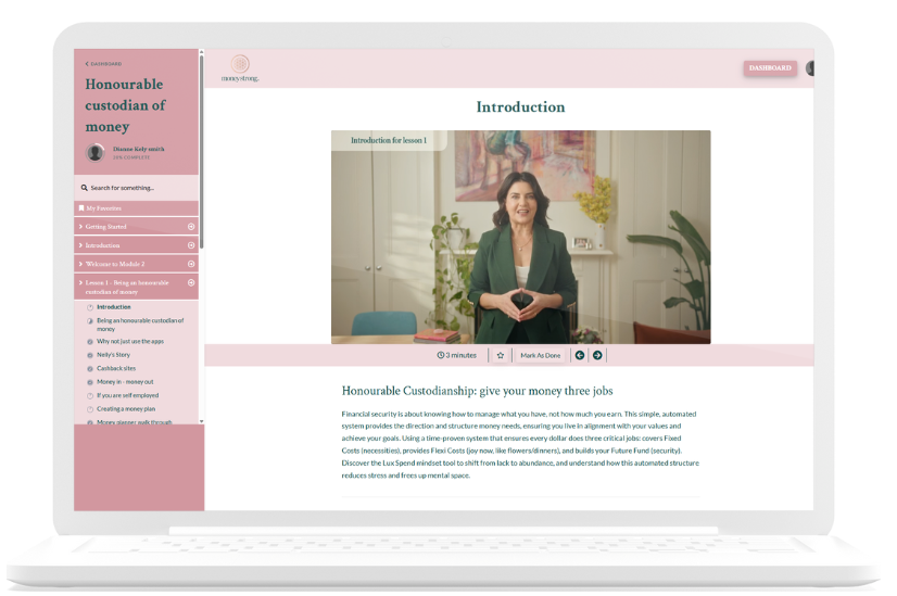 This program will support you to be an honourable custodian of your money and to build your confidence, capability and security when it comes to money.